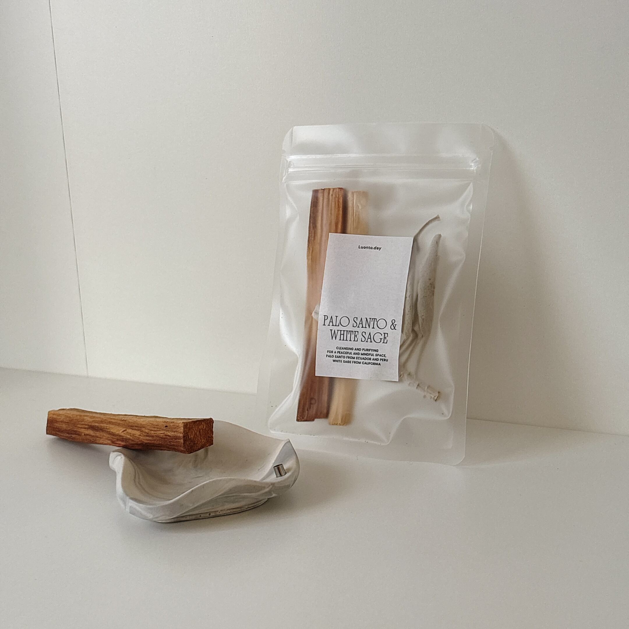 ・木片の先端に火をつけ、10秒ほど燃やしてから炎を吹き消し、耐熱皿に置き煙を空間に行き渡らせるようにして浄化を行います。